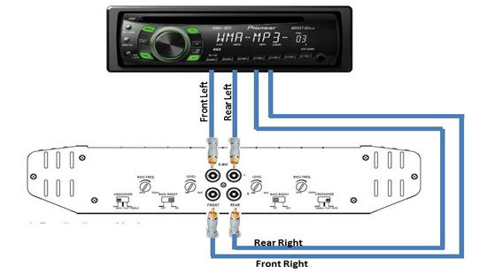 Для начала подсоединяем межблочные провода от магнитолы к усилителю. Если у вас четырехканальный усилитель, то потребуется две пары межблоков, для двухканального – одна пара межблочных проводов.
